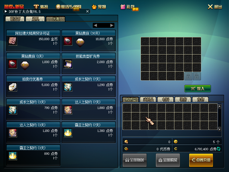 前期买套十几块的高级时装完全够用,十块钱的黑钻(月)必须的,前期这点投入玩着会轻松很多,不要为了省这二三十块钱给自己增加难度,后面随便卖点金币立马回血。